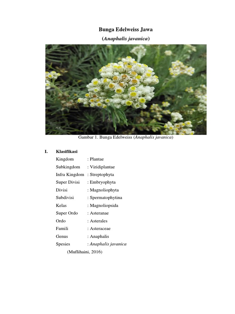 Akan tetapi, bunga edelweis memiliki nama limiah leontopodium nivale, sementara bunga edelweis jawa disebut sebagai anaphalis javanica. Bunga dari famili asteraceae ini abadi karena adanya hormon yang bisa mencegah kerontokan sehingga flora tersebut tahan lama dan tidak mudah rusak. Meskipun objek wisata dibuka sejak pagi hingga sore, namun pengunjung dapat berkunjung di waktu tertentu. Tumbuhan ini sangat mudah sekali ditemukan di tepi jalan. Edelweis dari indonesia, berbeda dengan edelweis dari negara lain seperti eropa. Taman edelweis berada di kawasan pegunungan, tentu udara terasa amat sejuk. Tetapi juga dilengkapi dengan aneka spot foto keren, misalnya seperti: Bunga ini dapat tetap tumbuh hingga mencapai 10. Disebut bungan keabadian, karena bunganya yang terus awet dan berada dipuncak gunung sebagai simbol keabadian. Warnanya berupa kombinasi kuning dan putih. Ada jutaa jenis bunga di muka bumi ini, dan berasal dari berbagai. Edelweis berasal dari 2 kata, yakni edel dan weis. Konon, nama edelweiss diambil dari bahasa jerman yang berasal dari kata edel (noble) dan weiß(white).
